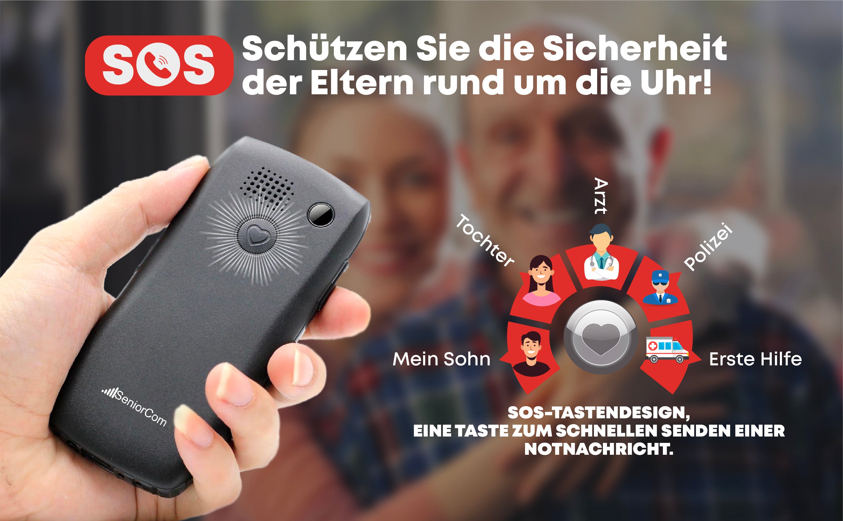Mit einem speziellen SOS-Knopf auf der Rückseite bietet SeniorCom T2 Ihnen auf schnelle Weise Hilfe bei Fragen in Notsituationen, da Verbraucher und ihre Familien Hilfe benötigen.
