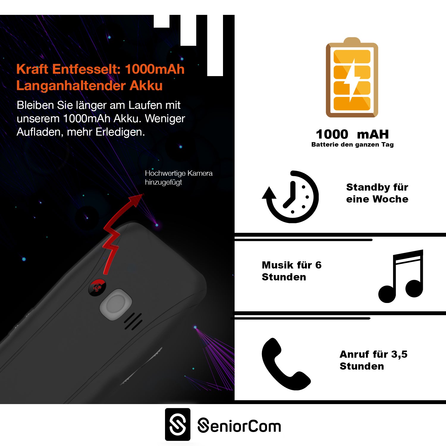 Das SeniorCom T2 garantiert, dass Sie es täglich ohne Aufladen verwenden können, dank der leistungsstarken Batterie, die für den dauerhaften Gebrauch entwickelt wurde.