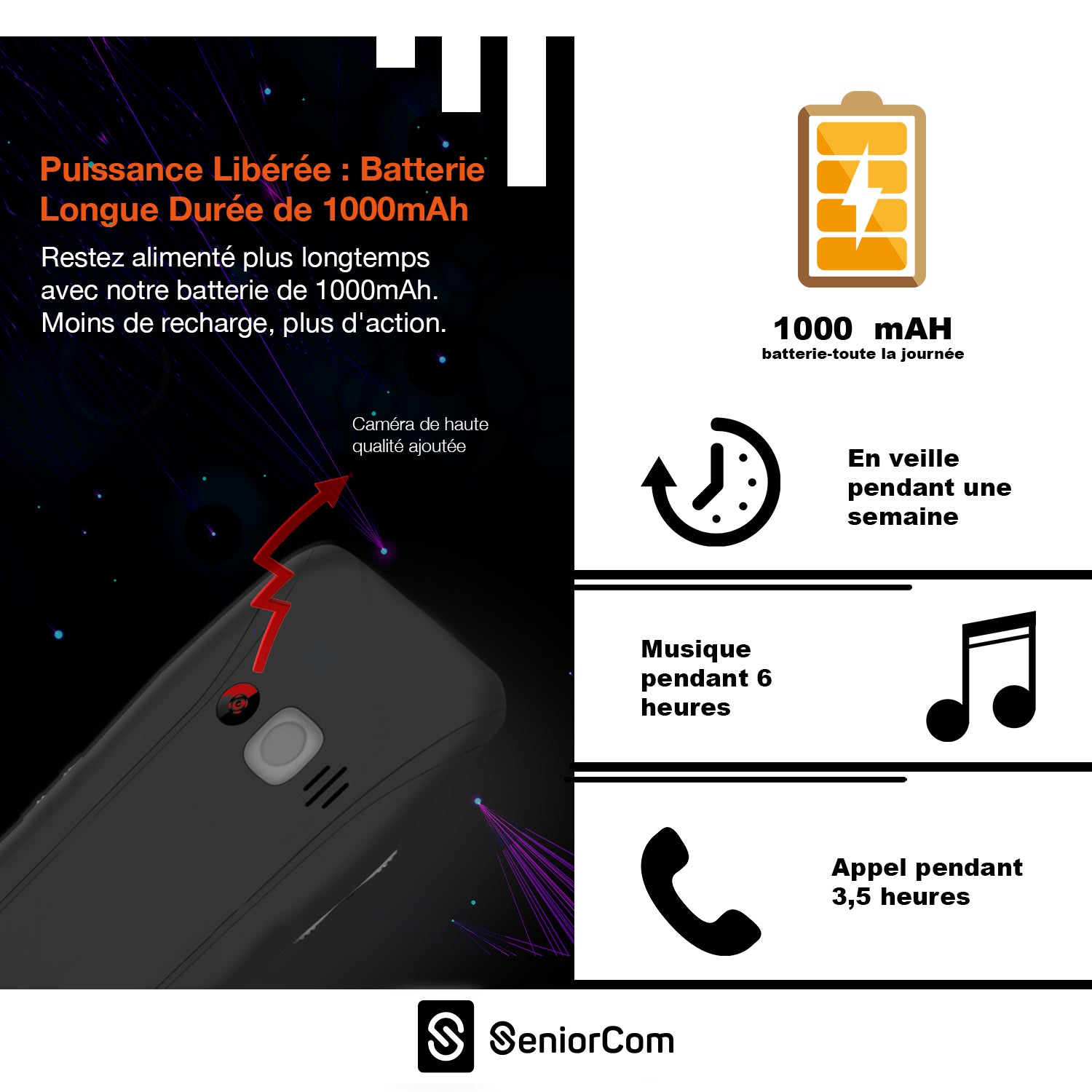 Le SeniorCom T24 vous garantit une disponibilité de plusieurs jours sans recharge intermédiaire, grâce à sa batterie puissante conçue pour une utilisation prolongée.